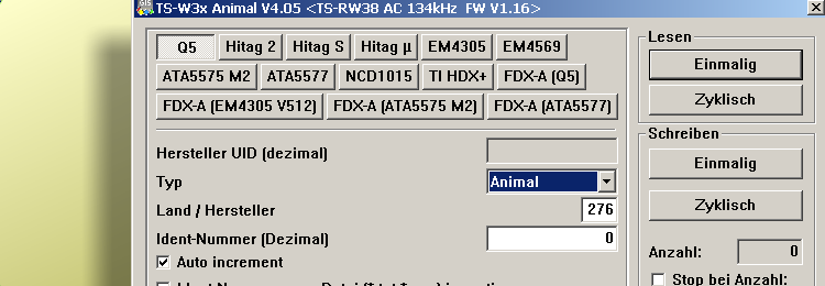 Das Programm schreibt und liest Animal-Transponder mit der ISO NORM 11784.